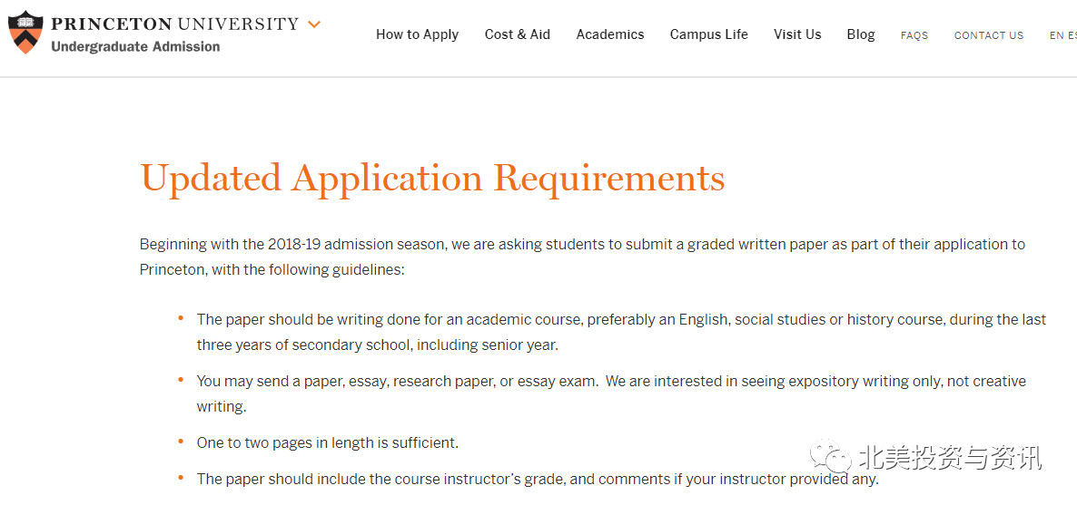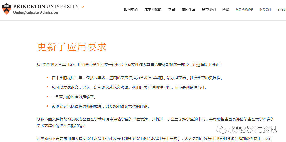 普林斯顿大学的官网更新信息。申请2019年入学的所有申请者,必须提供一份你写过的小论文,最好是关于英语或者历史科目,并且需要有老师评语。