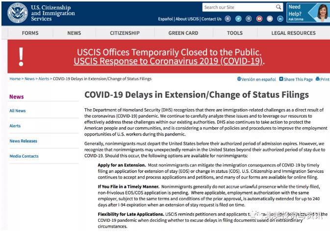 4月13日,美国移民局针对因疫情滞留在美国的非移民延期合法身份的问题发布一条消息。